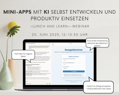 Am 20. Juni 2025 veranstalte ich in meiner neuen Reihe «Lunch and Learn» ein Webinar zur Erstellung von einfachen Web-Applikationen mithilfe von KI-Tools!